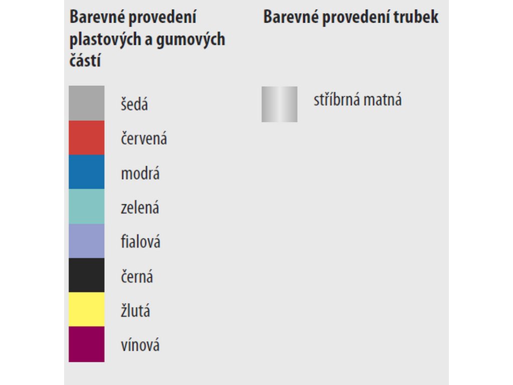 Kolorystykę części plastikowych i gumowych można łączyć z ośmiu różnych kolorów (patrz próbnik) według własnych upodobań lub wybrać z gotowych mieszanek kolorystycznych.
